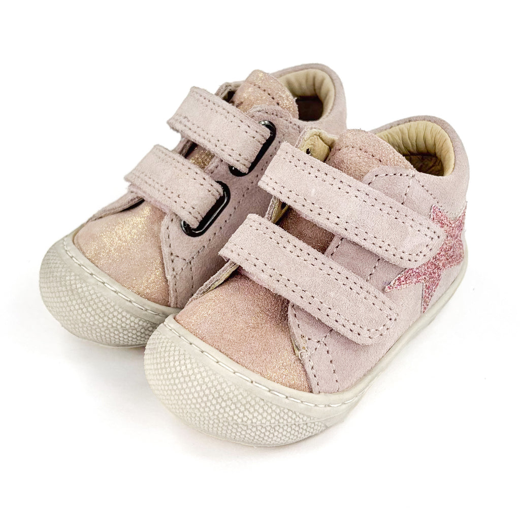 Offrez à vos enfants les chaussures premiers pas les plus appréciées avec la Basket Naturino Kolde style Cocoon. En joli cuir rose avec une étoile brillante, elles offrent un maintien optimal grâce à la construction au niveau de la cheville et la semelle en caoutchouc, souple, qui protège également les orteils. Le cuir respirant garantit le confort et la semelle antidérapante assure la sécurité.